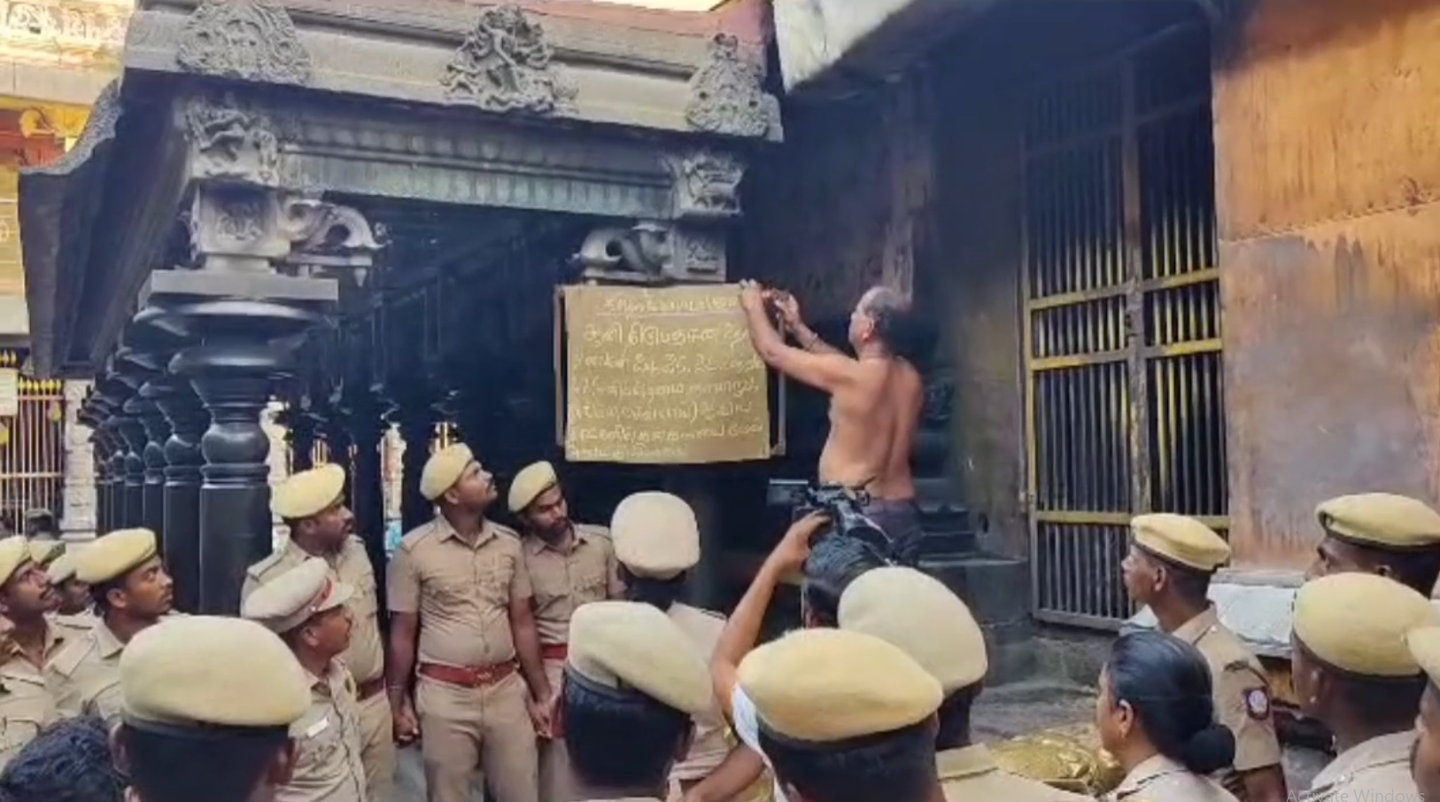 கடலூர் மாவட்டம், சிதம்பரம் நடராஜர் ஆலயத்தில் கனகசபை மீது ஏறி சாமி தரிசனம் செய்ய அனுமதி மறுத்து, தீட்சிதர்கள் வைத்த பதாகையை காவல்துறை உதவியுடன், இந்து சமய அறநிலை துறை அதிகாரிகள் அகற்றினர்.