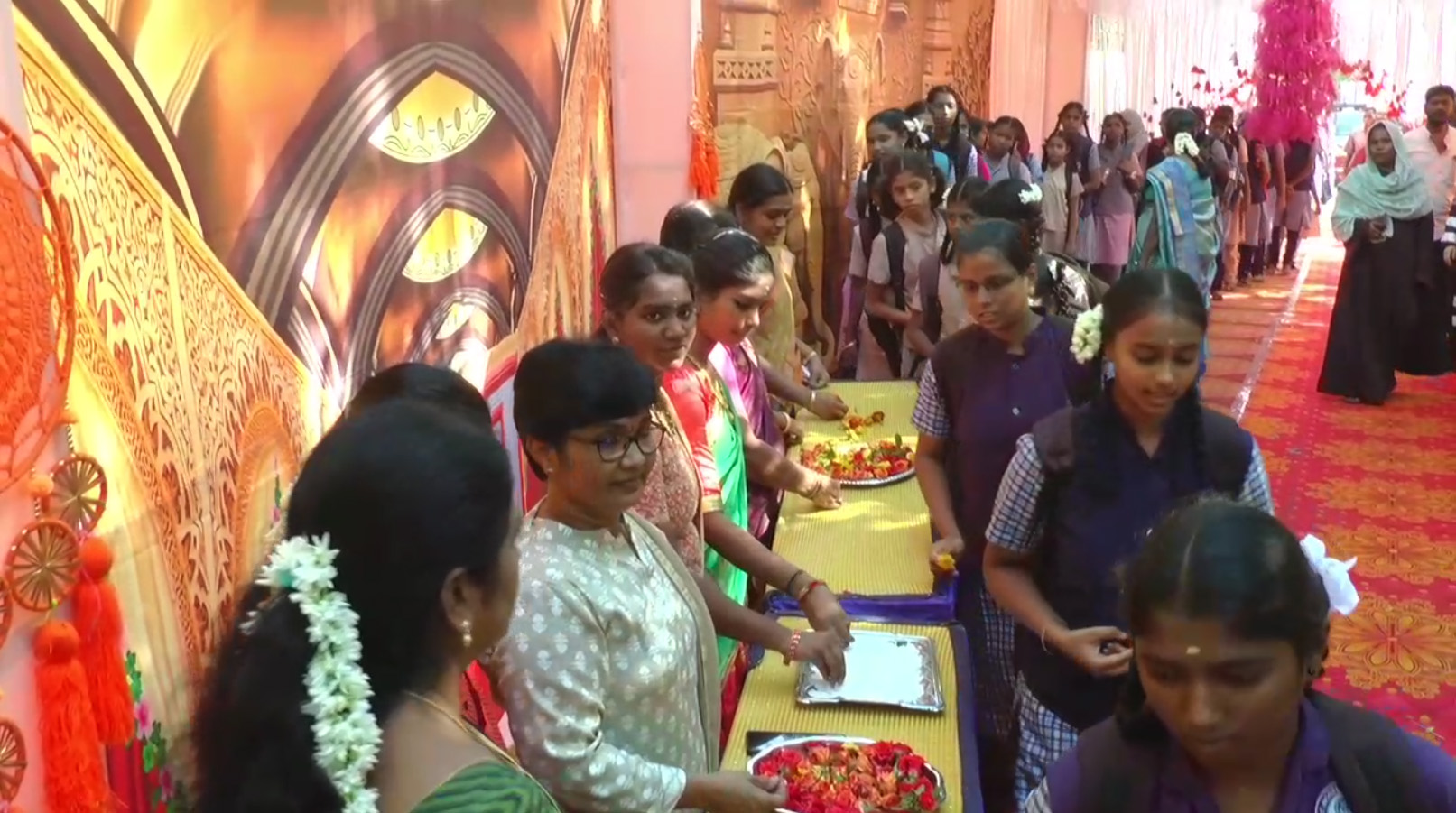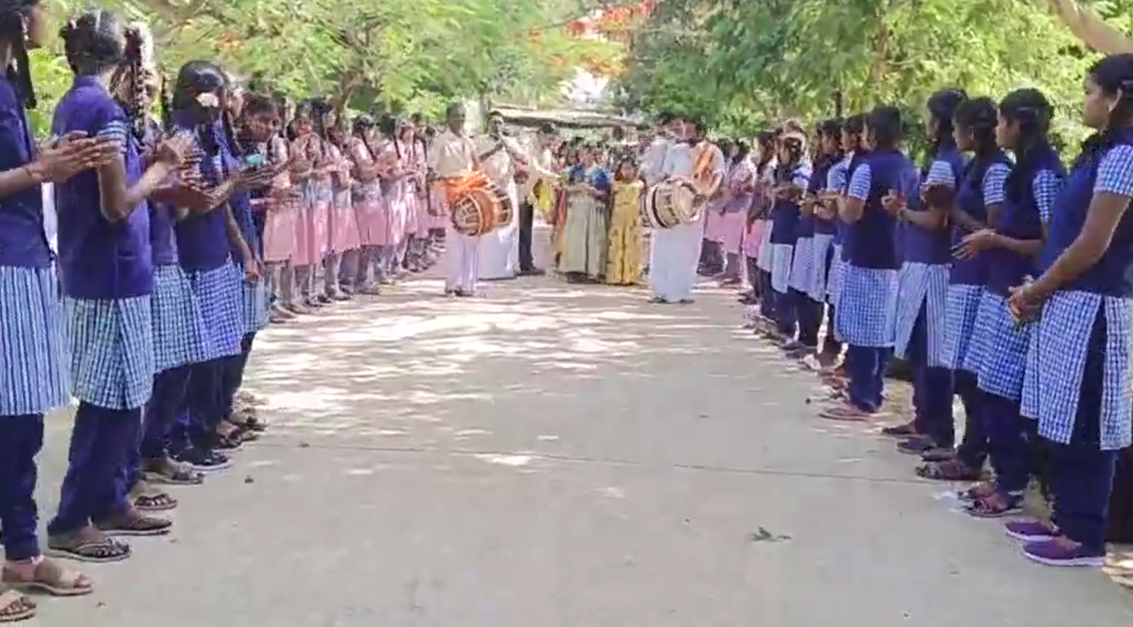 சிவப்பு கம்பளம் விரித்து வரவேற்ற பள்ளி